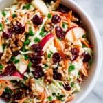Apple Cranberry Coleslaw is a vibrant and refreshing side dish featuring a colorful mix of shredded green and red cabbage, crisp apple, sweet dried cranberries, and a tangy, creamy dressing. This no-cook salad combines the crunch of fresh vegetables and fruit with a slightly sweet and tangy mayo-based dressing, making it perfect for fall gatherings, holiday meals, or as a healthy accompaniment to grilled meats and sandwiches.