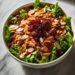 This refreshing Asian Chicken Cranberry Salad combines tender cooked chicken breast with a crisp mix of greens, red cabbage, and shredded carrots, accented by dried cranberries and toasted almonds. Tossed in a tangy sesame-soy dressing and topped with crunchy chow mein noodles, it’s a flavorful, healthy lunch option that comes together quickly with no cooking required.