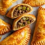 Classic Latin American Beef Empanadas featuring a flaky homemade dough filled with a savory ground beef, onion, and olive filling, baked to golden perfection. Perfect as appetizers or main dishes, these empanadas come together with simple ingredients and a delicious blend of spices for a comforting, satisfying treat.