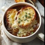 A classic French Onion Soup recipe featuring deeply caramelized yellow onions simmered in a rich beef broth, finished under the broiler with a crusty baguette topped with melted Gruyère and Parmesan cheeses. Perfectly savory, cheesy, and comforting, this soup is ideal for gatherings or cozy dinners.