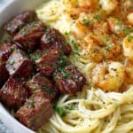 Reheat leftovers on the stove over low heat, adding a splash of milk to loosen the Alfredo sauce if it has thickened too much. Stir frequently and avoid high heat to keep shrimp tender and prevent the steak from drying out.