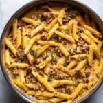 You can freeze this Cheesy Ground Beef Pasta Skillet Recipe for up to 2 months. Transfer cooled portions into freezer-safe containers or bags, pressing out as much air as possible. When ready to enjoy, thaw overnight in the refrigerator before reheating gently.
