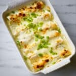 Delicious Chicken Enchiladas with a creamy sour cream white sauce, featuring tender shredded chicken, melty cheese, and a flavorful green chile sauce baked to perfection for a comforting Mexican-inspired main course.