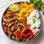 This Chicken Fajita Bowl recipe is a quick and flavorful meal perfect for busy weeknights. Juicy chicken breast sautéed with vibrant bell peppers and onions is seasoned with a fragrant blend of chili powder, cumin, and garlic powder. Served over fluffy cooked rice and customizable with toppings like shredded cheese, sour cream, salsa, and avocado, this dish brings bold Tex-Mex flavors right to your table in just 30 minutes.