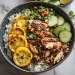 - Slice and assemble: Slice the rested chicken thighs and arrange them on bowls of prepared brown rice. Top with the prepared cucumber salad, additional herbs if desired, extra chili crisp, and garnish with lime wedges for squeezing.