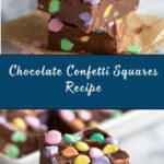 - Cool and Serve: Allow the chocolate confetti squares to cool completely in the pan. Once cooled, lift them out using the parchment paper overhang and cut into 9 squares.