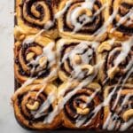Roll the rectangle tightly from the short side to form a log. Using a sharp ceramic knife, slice this log into 15 equal pieces. Next, position each piece flat and close together in a baking dish lined with parchment paper. Cover with a tea towel and allow the rolls to rise again for 20 to 30 minutes until they puff up and touch each other gently.