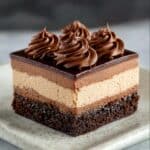 Decadent Chocolate Mousse Brownies that combine a rich, fudgy brownie base with a light and airy chocolate mousse topping. This dessert is perfect for chocolate lovers looking for a luscious treat with a creamy finish.