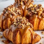 These Cookie Croissant Thanksgiving Bites combine flaky mini croissants with gooey chocolate chip cookie dough and crunchy pecans, finished with a drizzle of rich caramel sauce. Perfect for an easy, indulgent dessert or festive treat.