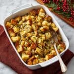 Yes, store-bought cornbread works just fine and makes this recipe even quicker to prepare. Just make sure it’s not too sweet, so it complements the savory dressing perfectly.