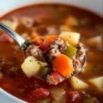 Cowboy Soup is a hearty, flavorful soup packed with ground beef, vegetables, and a blend of spices. This comforting one-pot meal combines potatoes, carrots, green beans, black-eyed peas, and corn simmered in a savory tomato and beef broth base, perfect for a satisfying dinner for the whole family.