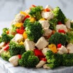 A refreshing and creamy broccoli and chicken salad combining tender chicken breast, crisp broccoli florets, and vibrant vegetables with a tangy Greek yogurt and mayonnaise dressing. This easy-to-make salad is packed with flavor and texture, making it perfect for a light lunch or a healthy side dish.