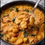 This Creamy Chicken and Gnocchi recipe is a comforting and flavorful dish combining tender pan-cooked chicken, pillowy potato gnocchi, and a rich creamy sauce infused with garlic, smoked paprika, sundried tomatoes, and Parmesan cheese. Finished with fresh baby spinach, it offers a delightful balance of savory and fresh flavors, perfect for a quick and satisfying dinner.