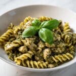 Transfer your Creamy Chicken Pesto Pasta: A Comforting Family Favorite Recipe to serving bowls or a big family platter. Garnish with fresh basil leaves and a few twists of black pepper. Now, dig in and enjoy a dish that feels like a warm, delicious hug in every forkful!