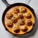 To reheat, thaw frozen meatballs overnight in the refrigerator for best results. Rewarm gently in a skillet over low heat until heated through, adding a splash of broth or cream if needed to revive the sauce’s creaminess. The low, slow reheating preserves their tender texture and rich flavor.