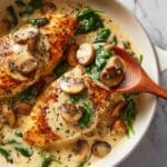 This Creamy Parmesan Garlic Mushroom Chicken is a rich and comforting dish featuring tender chicken breasts cooked to perfection and smothered in a luscious parmesan garlic cream sauce with sautéed mushrooms and spinach. Perfect for a quick weeknight dinner or a special meal, it offers a delicious blend of creamy textures and savory flavors that pair wonderfully with pasta or rice.