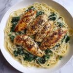 - Serve and Garnish: Plate the creamy pasta and top with the sliced chicken strips. Garnish with fresh parsley and lemon zest for a bright, fresh finish. Serve immediately while warm.