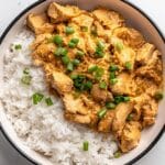 Serve the chicken hot over fluffy cooked rice and garnish with sliced green onions to add a fresh, mild crunch that completes the experience.