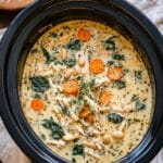 This comforting Crockpot Chicken Gnocchi Soup is a hearty and creamy slow-cooked soup featuring tender chicken thighs, diced vegetables, and pillowy potato gnocchi. Flavored with Herbes de Provence, garlic, and enriched with half and half, it is finished with fresh spinach and crispy prosciutto for added texture and flavor. Perfect for an easy, make-ahead meal that warms you up on cooler days.