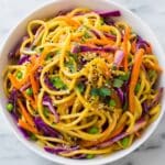 It’s best eaten fresh or within 1 to 2 days stored in the refrigerator. The noodles will soften over time, so for the best texture, keep the toasted noodles separate and add them just before serving.