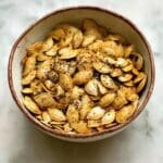 It’s best to start with raw pumpkin seeds because pre-roasted ones might not absorb the curry seasoning as well and could burn during the roasting process. Raw seeds ensure even roasting and perfect flavor infusion.