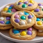 Yes, regular M&Ms work just as well if you don’t have seasonal Easter candies. The cookie will still taste wonderful—just without the specific pastel color palette.