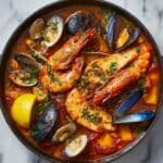 Fresh parsley and lemon wedges are classic garnishes that brighten the flavors and add a pop of color, making each serving visually appealing and vibrant. The lemon juice’s acidity perfectly balances the rich tomato broth while parsley adds fresh herbal notes that complement the seafood beautifully.