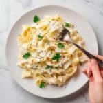 Fettuccine is the classic choice because its wide, flat shape holds the sauce beautifully. However, you can also use linguine, penne, or even gnocchi—just choose a pasta that will carry the creamy sauce well for maximum enjoyment.