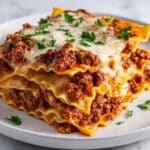 Keep alternating layers of meat sauce, noodles, and cheese mixture until all ingredients are used, finishing off with a generous layer of meat sauce on top. This layering is what makes the lasagna so indulgently satisfying bite after bite.