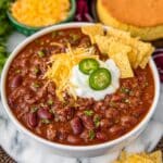 6. Adjust Seasoning and Serve: Taste your chili and adjust seasoning as needed with additional salt or spices. Serve hot and garnish with favorite toppings such as shredded cheese, sour cream, or green onions for extra flavor and texture.