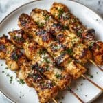 These Garlic Parmesan Chicken Skewers are a flavorful and juicy grilled chicken dish, marinated in a savory mixture of garlic, Parmesan cheese, lemon juice, and Italian seasoning. Perfectly charred and tender, they make a delicious appetizer or main course served alongside garden salad, roasted potatoes, or light pasta.