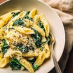 If you find yourself with leftovers, store the pasta in an airtight container in the refrigerator. It’s best enjoyed within 2 days as spinach tends to release water over time, which can change the texture, but the flavors remain lovely and fresh.