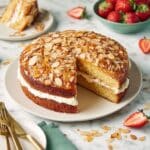 Because this cake is best enjoyed fresh, store any leftovers covered tightly in the refrigerator to keep the pastry cream fresh and the almond topping from absorbing moisture. Wrapped well, it can stay delicious for up to two days, though the topping may soften slightly over time.