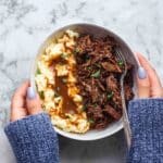 - Serve: Spoon gravy over mashed potatoes and serve with shredded pot roast.