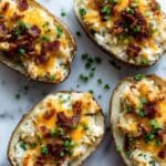 Spoon the rich filling back into the hollowed potato shells, mounding it high. Sprinkle the reserved cheddar cheese and bacon over the top, creating a delicious cheesy and crunchy surface that will melt and crisp beautifully during baking.