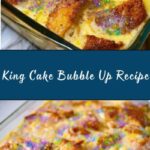 A festive and fun King Cake Bubble Up recipe that captures the flavors of traditional king cake in an easy-to-make casserole form. Layers of cinnamon roll pieces mixed with a creamy custard-like batter, baked until golden and topped with vibrant purple, yellow, and green sugar for a colorful Mardi Gras-inspired treat.