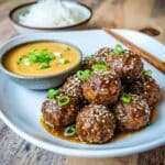 - Serve: Remove meatballs from oven and serve warm with the spicy mayo dip on the side or drizzled over the top. Garnish with extra green onions or sesame seeds if desired for added flavor and presentation.