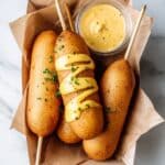 Serve these corn dogs on a wooden platter lined with parchment paper for a street-food vibe. Or, get playful by arranging them on skewers vertically in a festive jar or glass, making them easy to grab and share. Presenting with little bowls of dipping sauces like spicy ketchup, mustard, or aioli invites everyone to customize their bites.