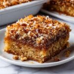 This cake is hearty and flavorful enough to stand on its own, but for a little extra flair, consider topping slices with a dollop of whipped cream or a scoop of vanilla ice cream. Fresh berries or a light dusting of powdered sugar can also add a pop of color and brightness, balancing the rich coconut pecan topping.