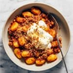 You can freeze cooked gnocchi and sauce together, but the golden crispies should be made fresh after thawing. Transfer leftovers to a freezer-safe container and freeze for up to 2 months. Thaw overnight in the fridge before reheating.
