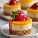 These cheesecakes are best enjoyed cold or at room temperature. If you’d prefer a warm dessert, briefly warm them in the microwave for about 10 seconds, just enough to soften slightly without melting the structure or creaminess.