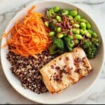 While the salmon bakes, get the grain ready by cooking brown rice or quinoa according to package instructions. Steam your broccoli until it’s bright green and just tender—this keeps its nutrients and color intact. Shred or julienne the carrot and shred the red cabbage to add fresh crunch and brilliant color contrasts to your bowl. These simple steps bring vibrant textures and flavors that complement the rich salmon perfectly.