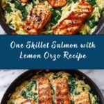 This One Skillet Salmon with Lemon Orzo recipe is a quick and delicious meal perfect for busy weeknights. Tender salmon fillets are seasoned and seared to perfection, then combined with garlic-infused orzo pasta cooked in chicken broth. Finished with fresh spinach, tangy lemon juice, and Parmesan cheese, this dish offers a harmonious balance of flavor and nutrition all made in a single skillet for easy cleanup.