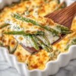 To reheat, place the green beans in an oven-safe dish and warm in a 350ºF oven for about 10 minutes or until heated through. This helps restore the crispy top and prevents the beans from becoming soggy, which can happen with microwave reheating.