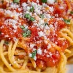 You can freeze this pasta sauce separately in freezer-safe containers for up to three months. When you’re ready to eat it, thaw overnight in the refrigerator and reheat gently. Cooked pasta doesn’t freeze as well, so it’s best to combine the two after reheating the sauce.