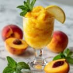 Pour your glorious Peach Lemonade Slushie: The Ultimate Summer Refreshment Recipe into glasses or mason jars and adorn with lemon slices, peach wedges, and a sprig of fresh mint for that irresistible, inviting touch.