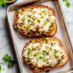 This Philly Cheesesteak Garlic Bread combines the classic flavors of a Philly cheesesteak sandwich with crispy, buttery garlic bread for a delicious and easy-to-make appetizer or meal. The recipe features seasoned ground beef, sautéed onions and peppers, savory sauce, provolone cheese layers, and a sprinkle of fresh parsley all baked on a toasted Italian loaf.