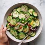 - Prepare Vegetables: In a large bowl, combine the thinly sliced cucumbers, red onion, and bell pepper. Sprinkle them evenly with the salt and let the mixture sit for a few minutes to draw out excess moisture and enhance flavor.