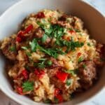 A hearty and flavorful one-pan meal combining Italian sausage, long-grain rice, and savory vegetables, simmered together with herbs and tomatoes for a comforting dish that’s perfect for any weeknight dinner.