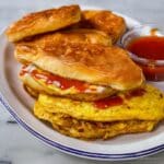 - Flip and Toast: Carefully flip the whole sandwich and toast the bun’s top side for 30 seconds. Fold any excess omelette over the bun edges. Remove from pan and repeat with remaining ingredients.